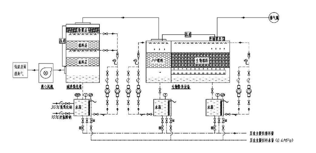 Opmerking: Dit proces is voornamelijk toepasbaar voor de behandeling van onwelriekende gassen die bestaan uit zwavelhoudende verbindingen (H₂S, SO₂, mercaptanen, sulfiden, enz.), stikstofhoudende verbindingen (NH₃, trimethylamine, amiden, enz.), halogenen en hun derivaten (chloorgas, gehalogeneerde koolwaterstoffen, enz.).